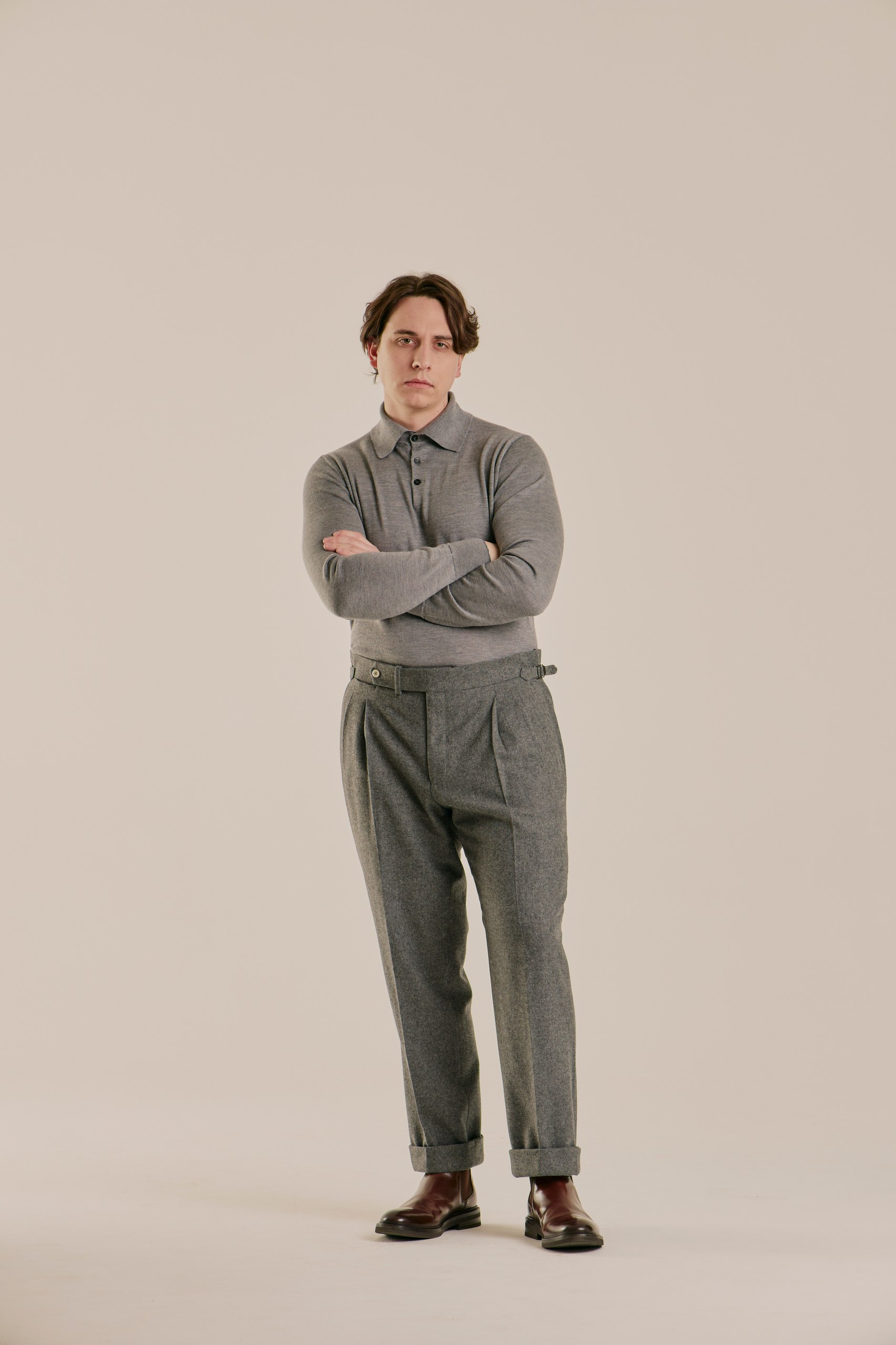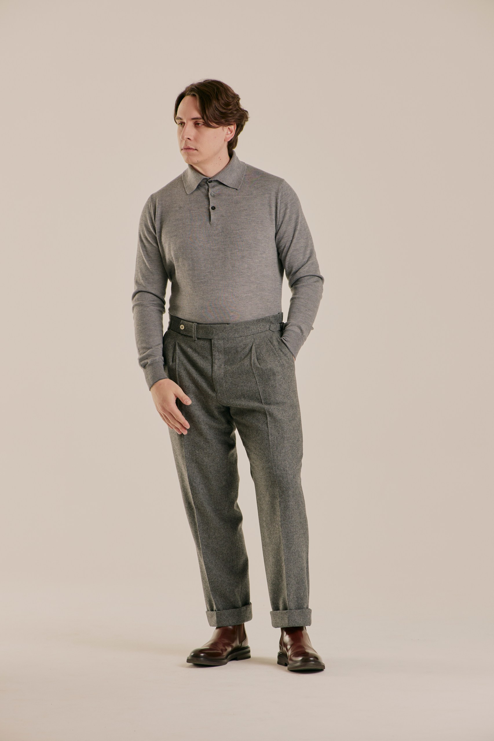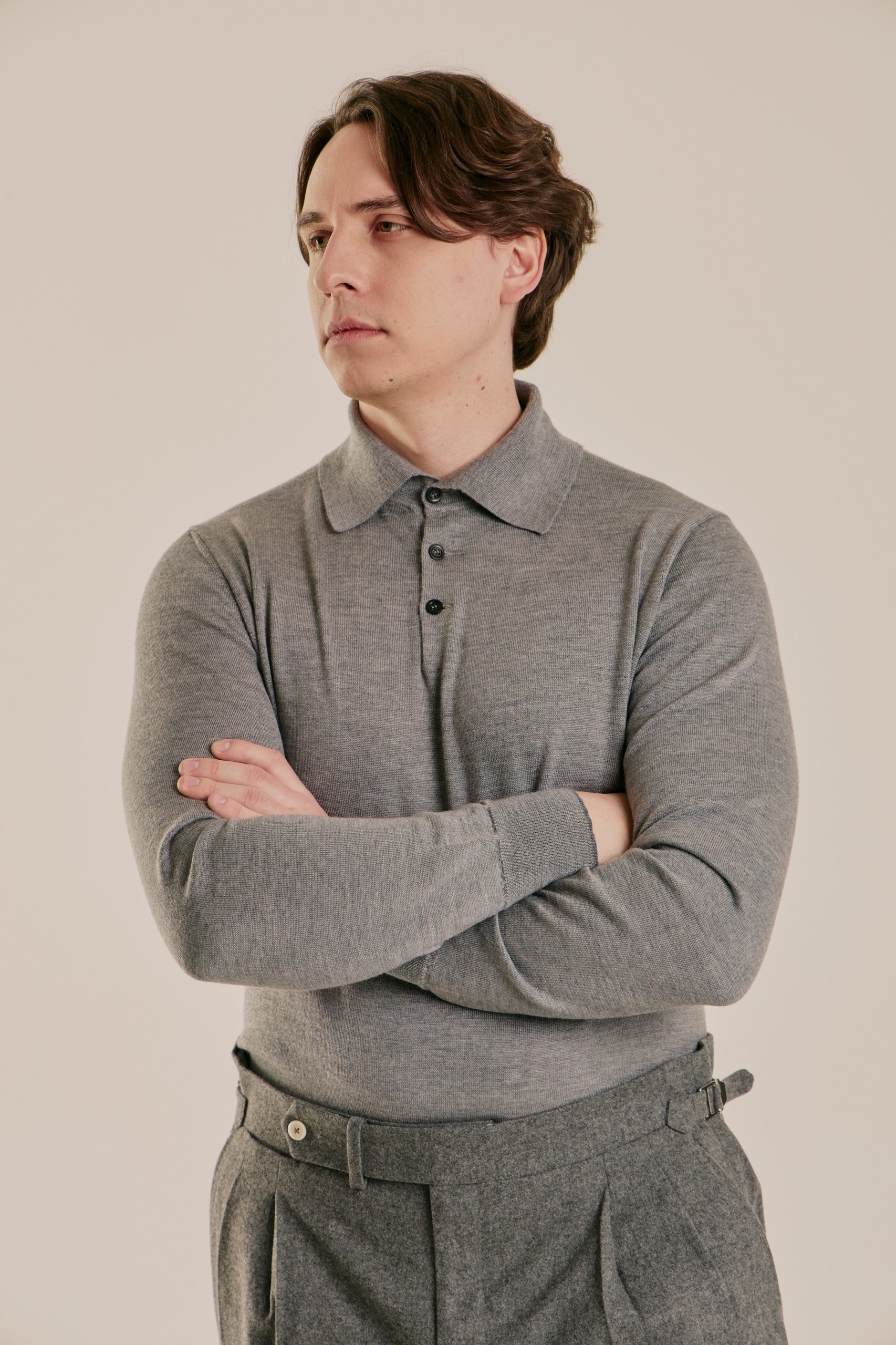 Поло, которое создаёт ощущение уюта, но не перегревает. Смесь кашемира и шёлка даёт идеальный баланс между теплом и лёгкостью: в нём комфортно и в прохладном офисе, и на улице под пальто. Шёлк добавляет мягкого блеска и делает ткань более гладкой на коже, а кашемир сохраняет природную теплоёмкость и пластичность. Это не вещь «на мороз», а универсальный слой для жизни в ритме города — когда хочется тепла, но без тяжести.