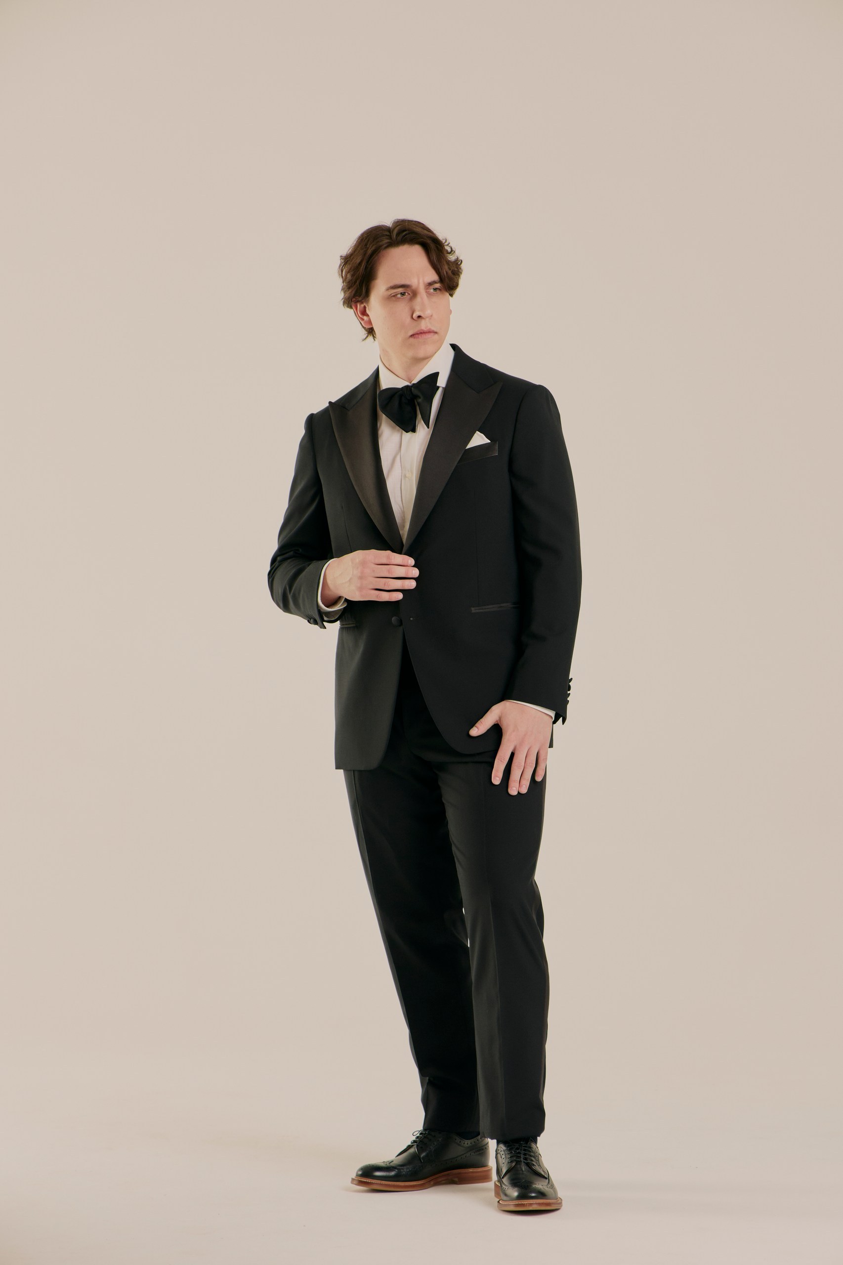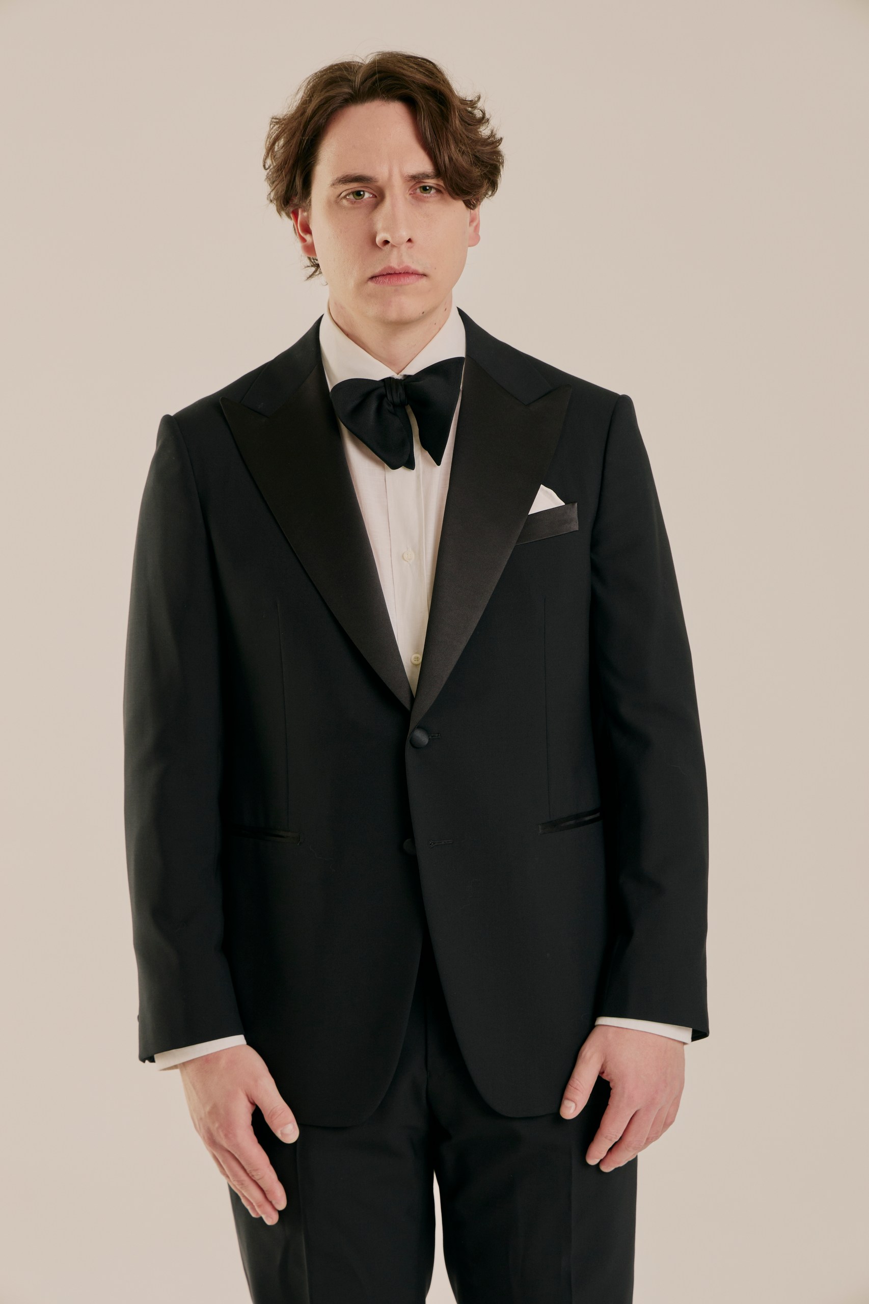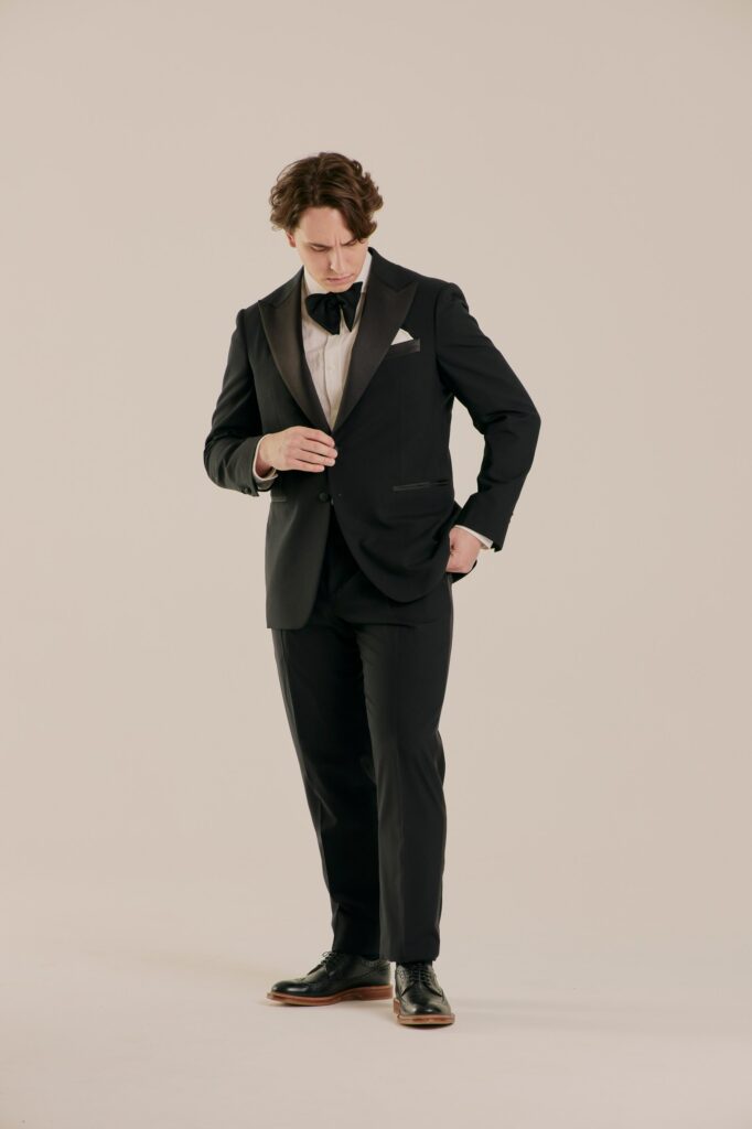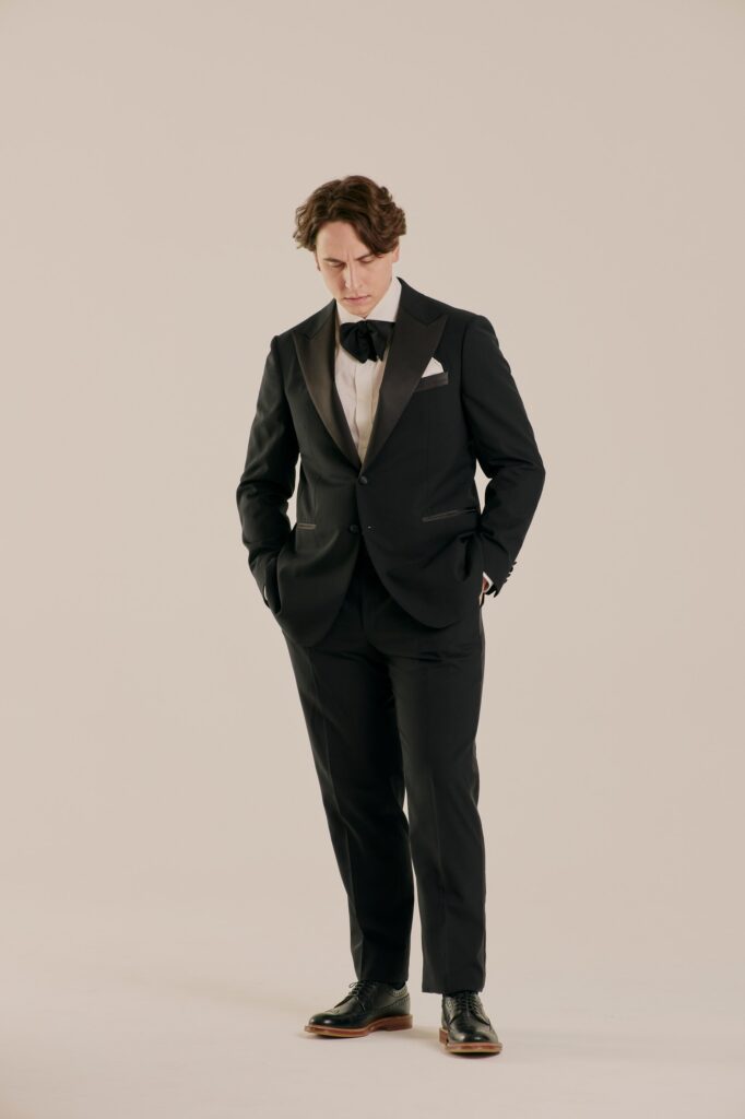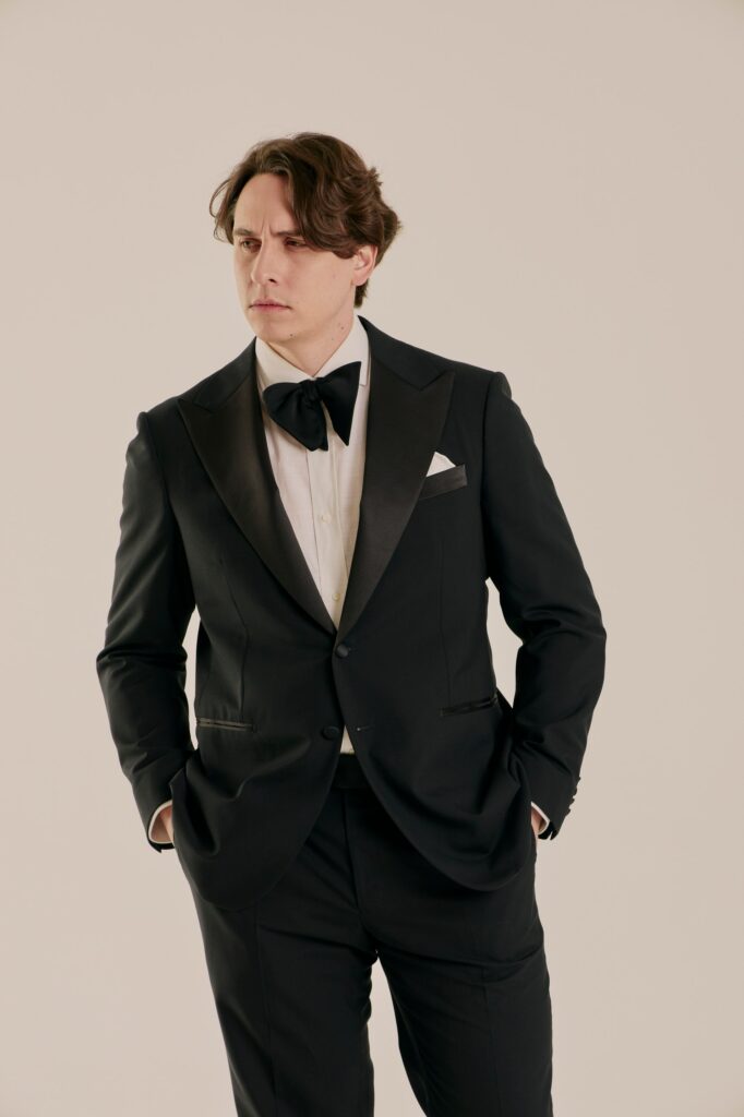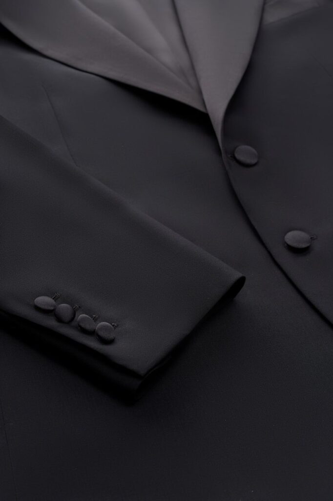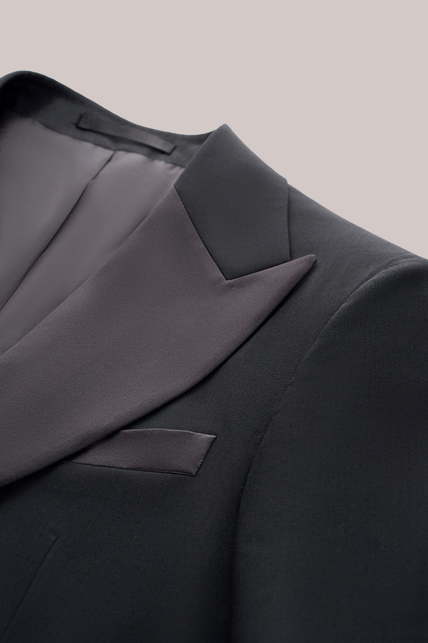 Классический смокинг для особых случаев, где важна каждая деталь. Выполнен из тончайшей шерсти Super 120’s от Vitale Barberis Canonico — ткани, сочетающей плотность и благородный блеск. Мягкая итальянская посадка, лацканы с шелковым отливом и выверенные пропорции создают образ безупречного формального стиля. Формат Black Tie в его правильном, сдержанном исполнении.
