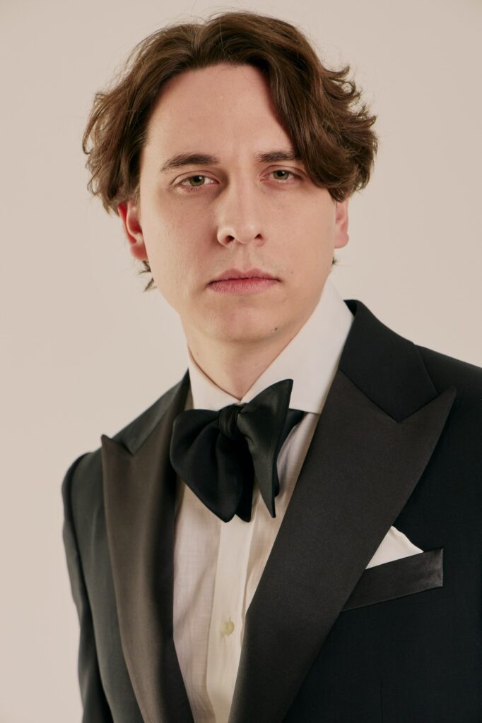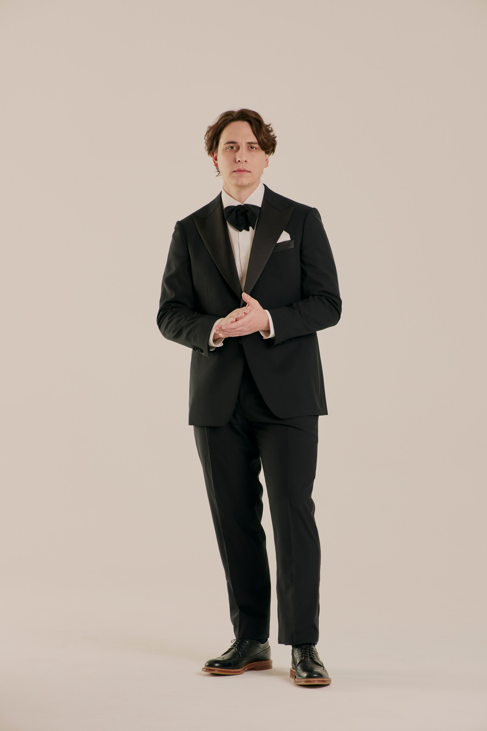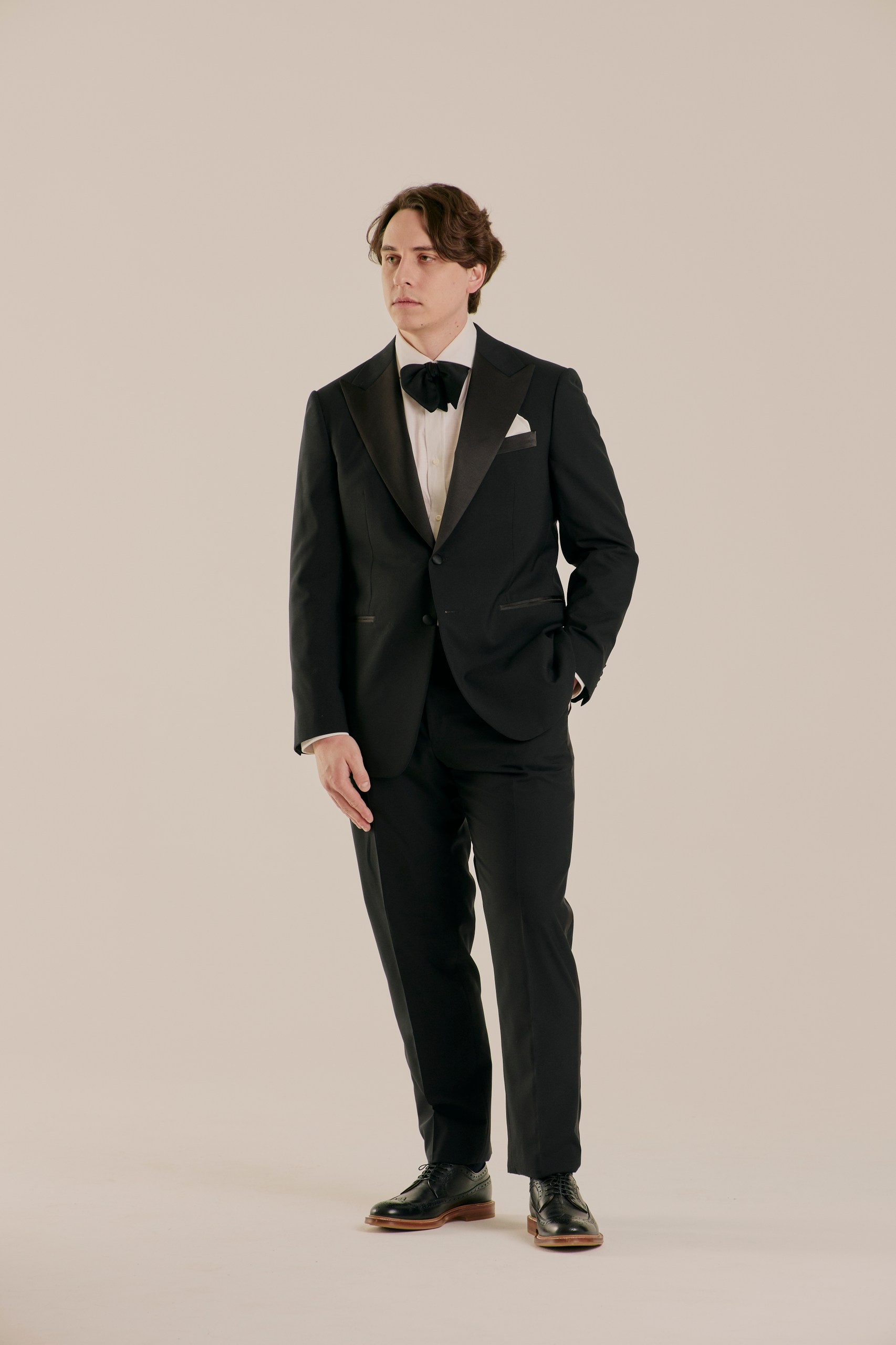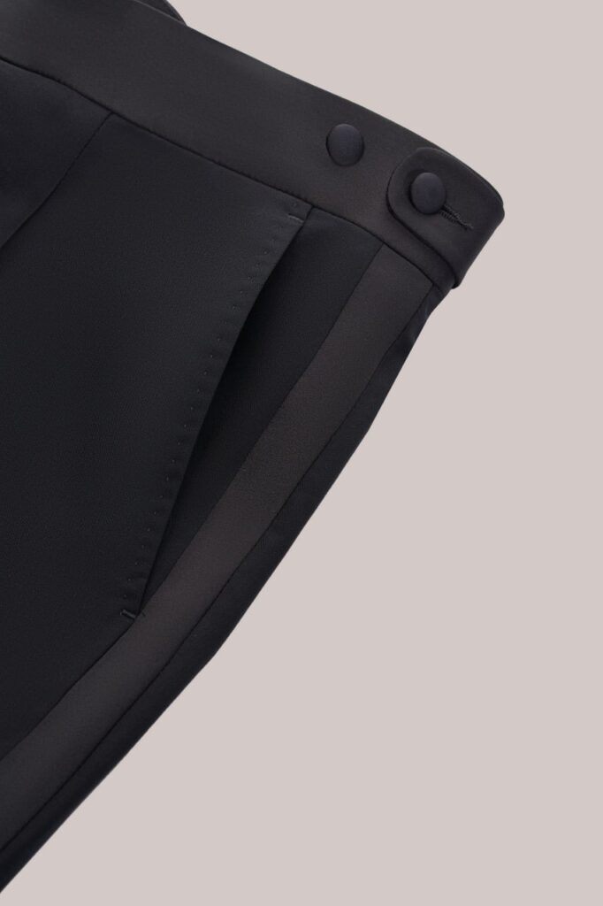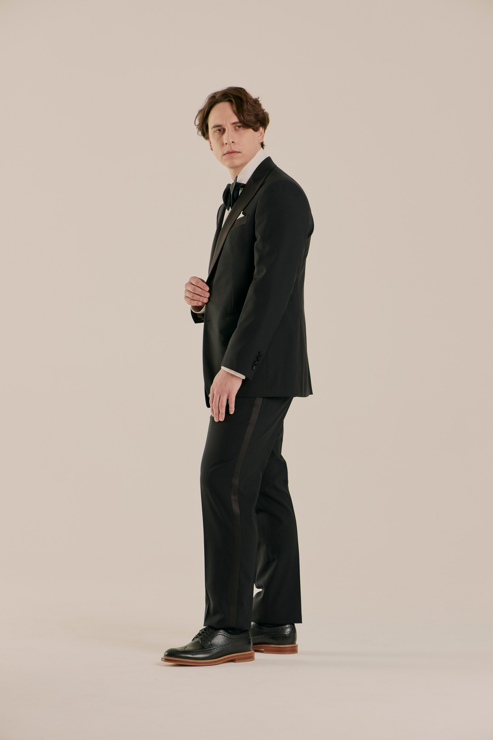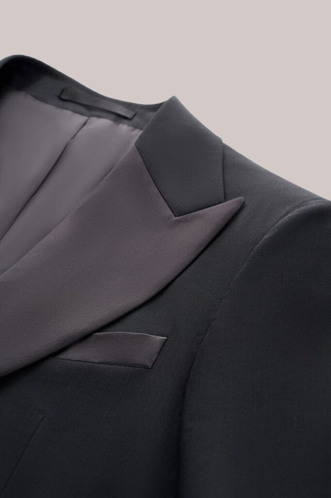 Классический смокинг для особых случаев, где важна каждая деталь. Выполнен из тончайшей шерсти Super 120’s от Vitale Barberis Canonico — ткани, сочетающей плотность и благородный блеск. Мягкая итальянская посадка, лацканы с шелковым отливом и выверенные пропорции создают образ безупречного формального стиля. Формат Black Tie в его правильном, сдержанном исполнении.